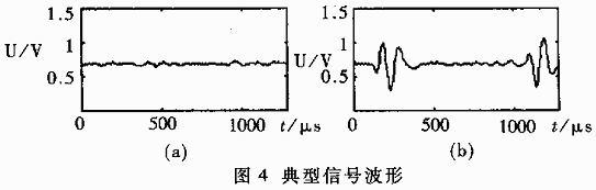 當標簽通過商場的出口通道處時,由于發射器和接收器之間射頻電磁場的作用,接收的信號波形會發生變化。通過鑒別接收信號的波形特征就可以判斷是否有標簽通過。通常由于在一個周期中標簽所在的頻點被掃到兩次,因而在環境比較好的情況下,一個周期有兩個比較大的波形峰值。圖4(a)和圖4(b)分別是無標簽和有標簽時接收信號的波形。