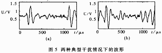 然而實際的現場環境差別較大,接收到的信號情況復雜。有時表現為環境的整個噪聲水平高,有時又表現為固定頻率的干擾。例如,當用手握住接收天線時,接收的信號會在一定的頻率點產生整個較大的波峰,而整個信號的波形,總體上的強度并不是很大,但在特定的位置上會產生幾個波峰。這種情況下的信號與有標簽通過時的信號相似,但是通過它與典型標簽信號的頻譜分析對比可以區分。而當用金屬物體碰撞天線或與天線摩擦時,產生的接收信號的幅度在整體上有很大的提高,接收波形雜亂無章,采用相關運算可以區分。圖5(a)和圖5(b)分別是這兩種情況下的接收信號波形。