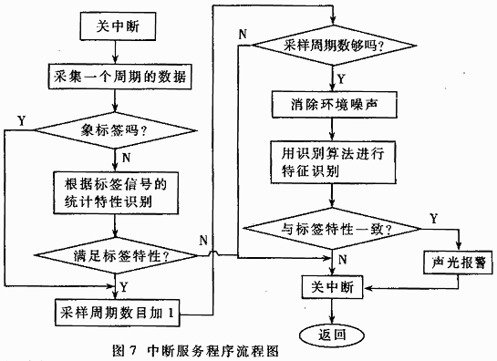 針對系統對實時性要求比較高,CPU采用中斷工作方式。主程序對硬件初始化手,等待中斷。中斷服務程序主要完成數據采集和標簽辨識,其流程如圖7所示。系統中斷脈沖的時間間隔大約5.6ms,所以中斷處理程序必須在這個時間內完成。當微處理器采用TMS320F206(主頻為20MHz)時,一個指令周期為 50ns,DSP的結構保證了能在較短的時鐘內完成相關、FFT等復雜運算。